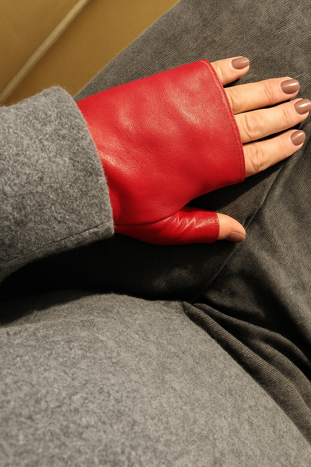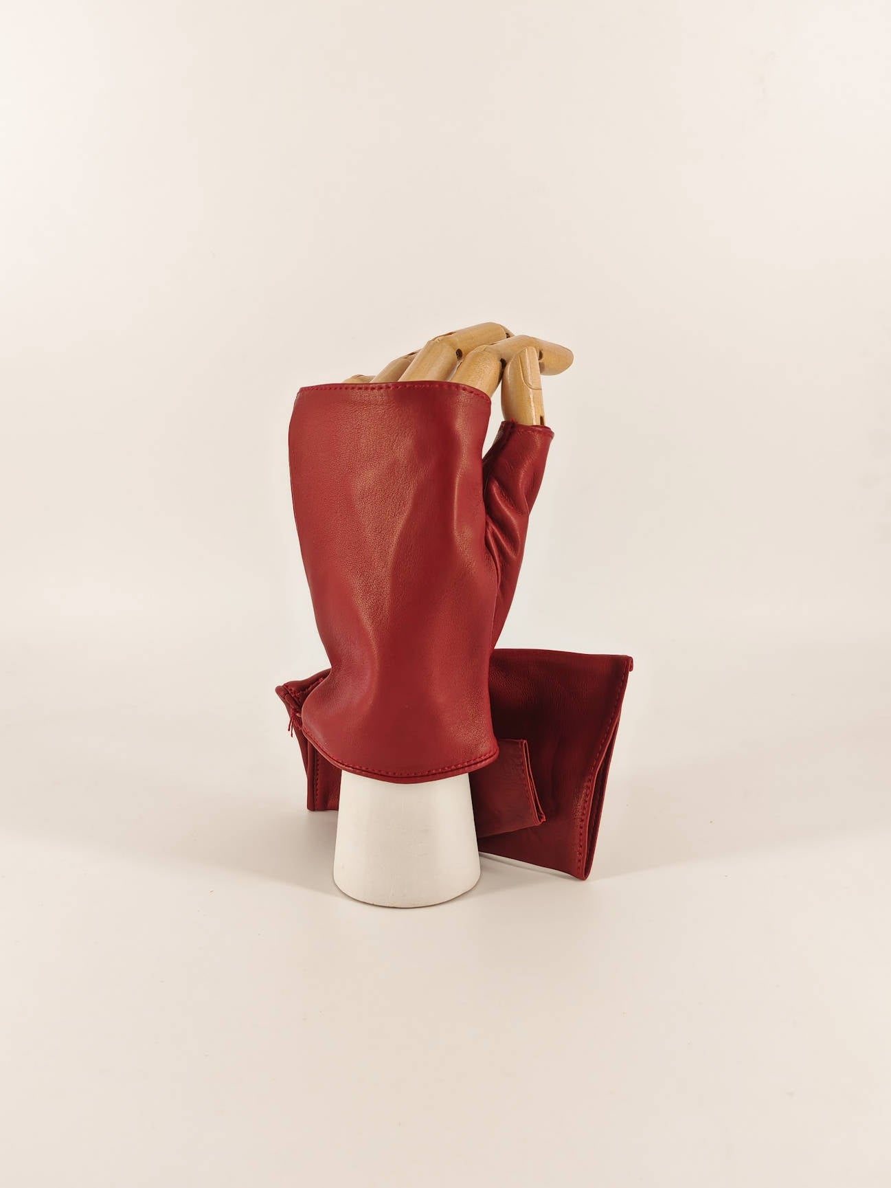 Handcrafted leather gloves. With a button on the wrist and half fingers.