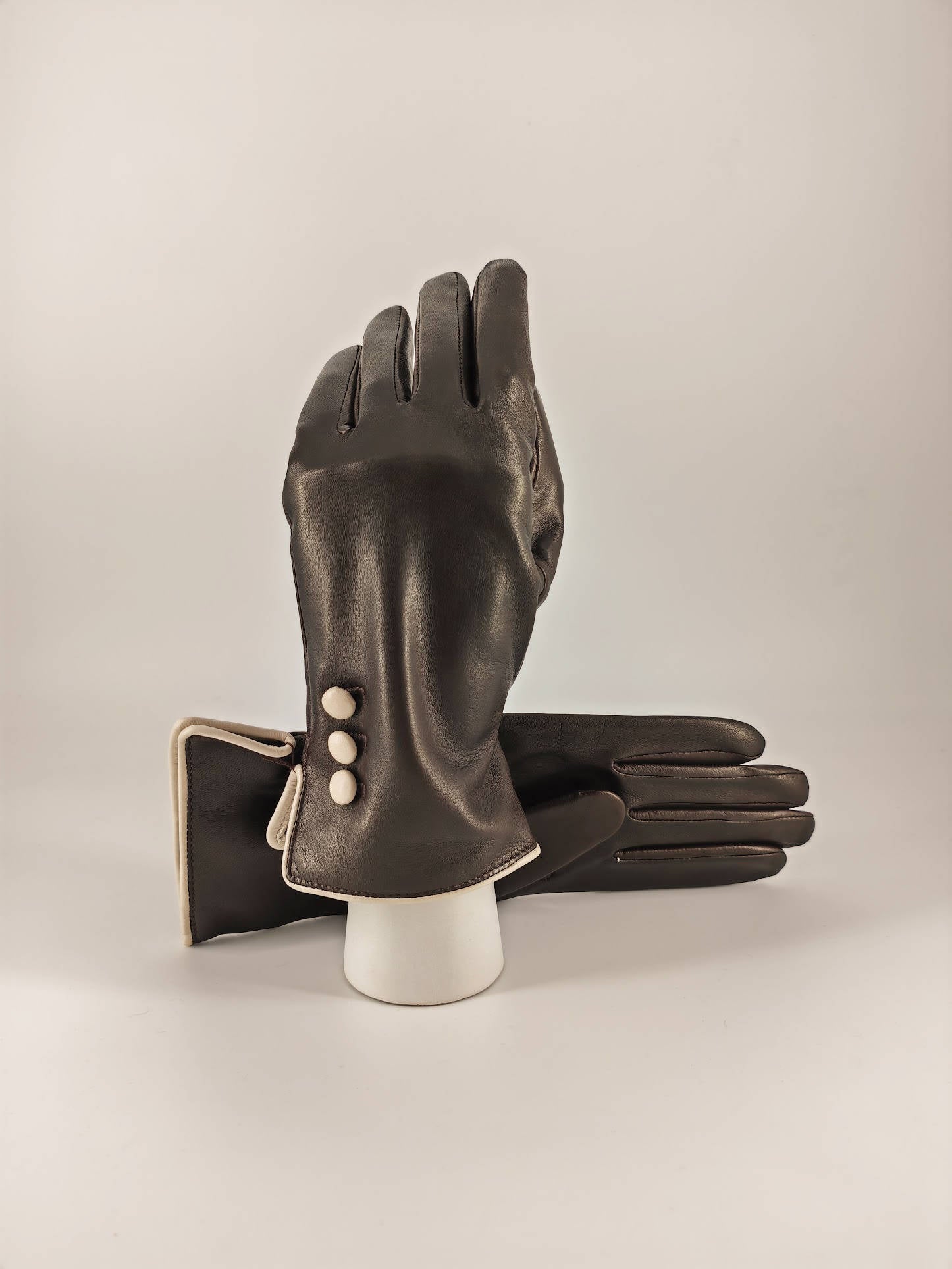 Guanti in pelle lavorati a mano. Con 3 bottoni sul dorso e un apertura laterale. I bottoni e il bordino sono di colore diverso.